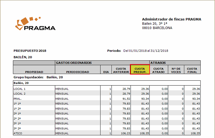 En el caso de que la comunidad liquidase los gastos ordinarios por gastos e ingresos, se cambia el título dela columna CUOTA ACTUAL por CUOTA PRESUP.