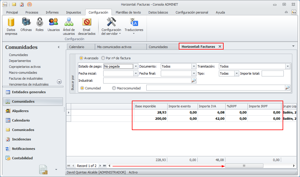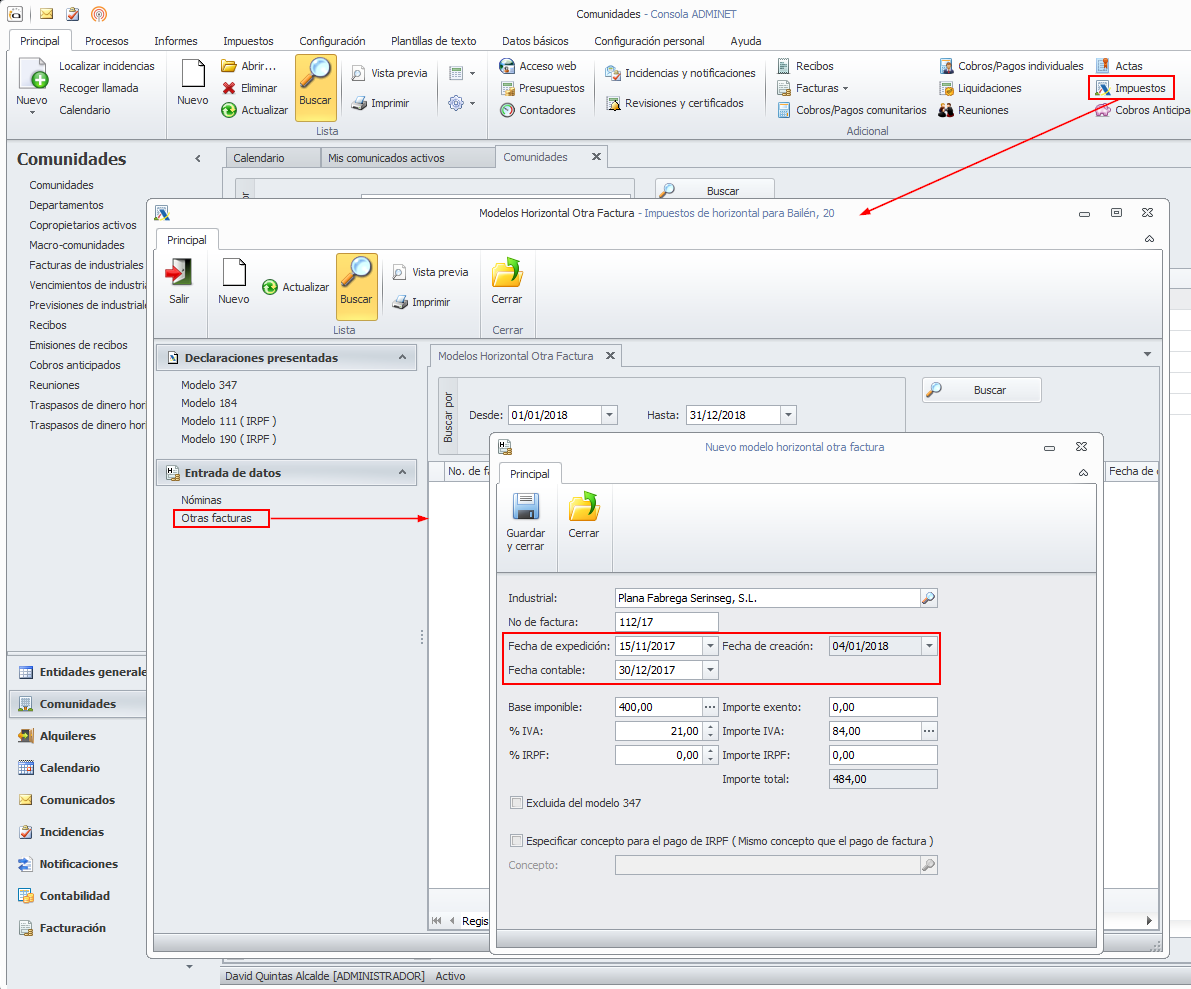 Esta misma lógica se aplica en la sección Otras facturas, que se puede encontrar en el botón Impuestos de la cinta de botones de las comunidades.