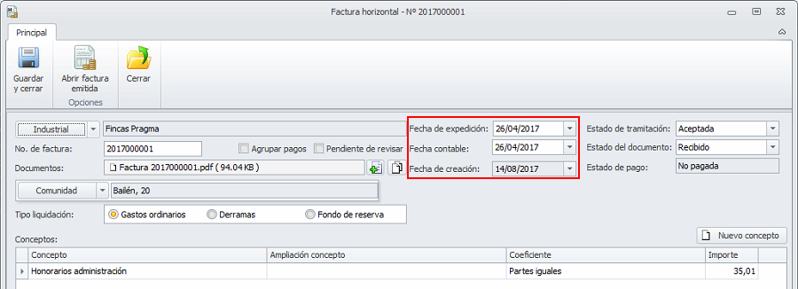 En versiones anteriores la ficha de la factura de industrial incorporaba dos fechas: