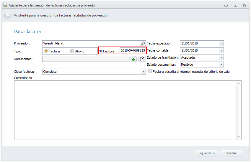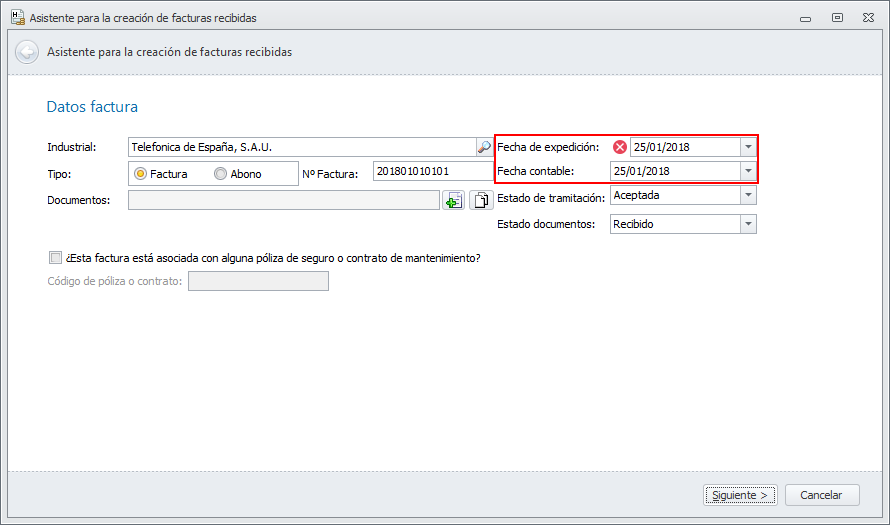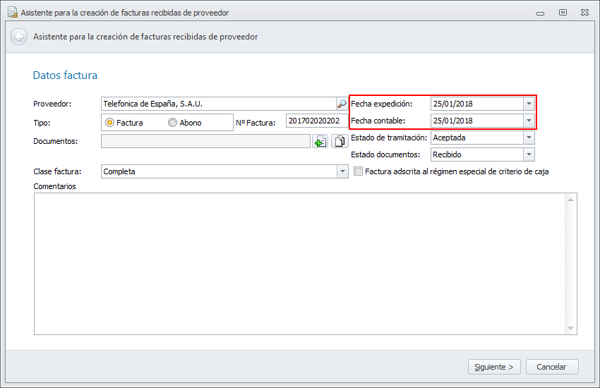 En el asistente, cuando se introducen las fechas, si la fecha de expedición es posterior a la fecha de proceso, el programa permite continuar adelante con el registro. En cuanto a la fecha contable debe ser siempre igual o posterior a la fecha de expedición.