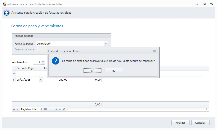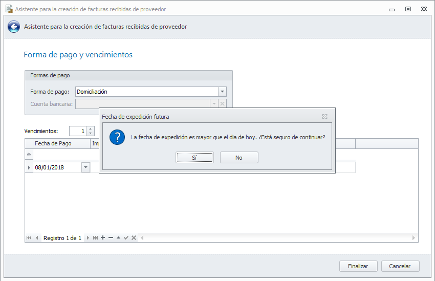 En el mismo asistente, cuando finaliza la introducción de datos, si la fecha de expedición introducida es posterior al día de proceso, muestra una ventana de advertencia, permitiendo al usuario continuar con el registro.