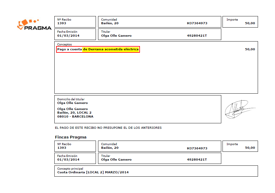 En el apartado Movimientos de caja del menú de Contabilidad, se ha mejorado la impresión del documento de cobro a cuenta de los recibos de comunidad, para detallar los conceptos sobre los cuáles se realiza ese cobro parcial.