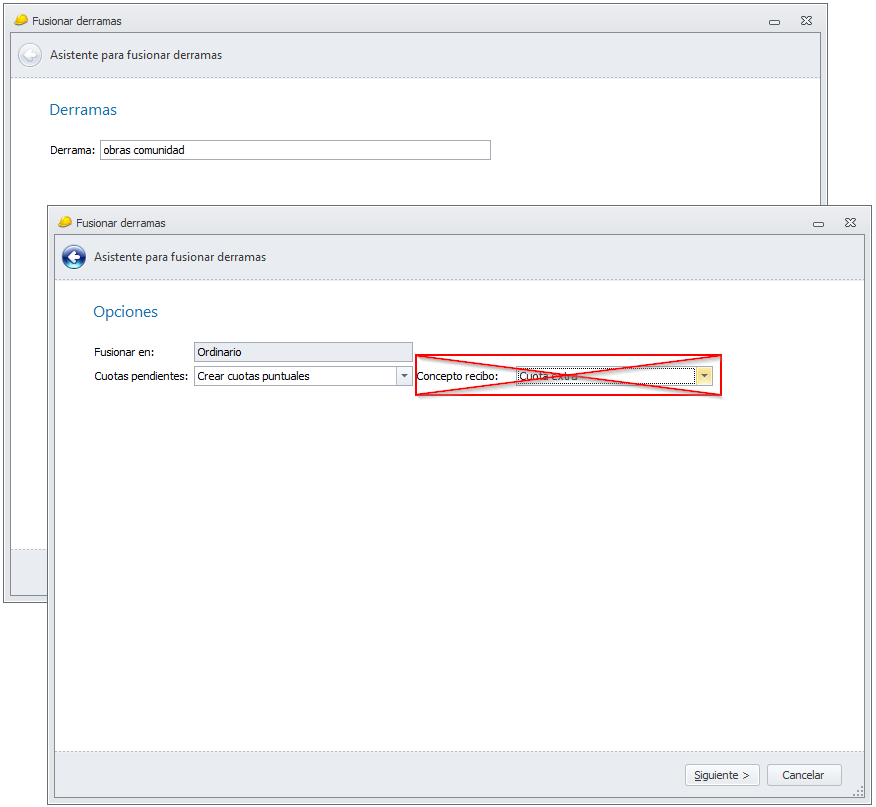 Tras escoger la derrama a fusionar, en la ventana Opciones, tras indicar que las cuotas pendientes se van a convertir en Cuotas puntuales, el programa solicitaba el concepto de recibo que se debía asignar a esas cuotas pendientes. Se ha eliminado la petición del concepto de recibo y las cuotas pendientes pasarán a tener el concepto Cuota extra.