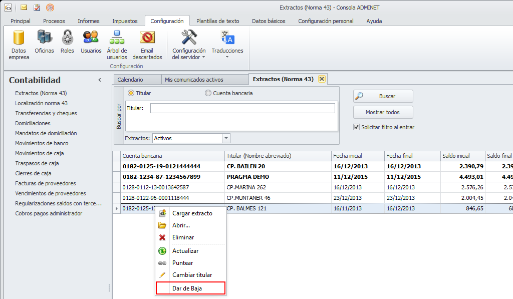 1.- Haciendo clic derecho sobre el propio extracto y escogiendo la opción Dar de baja.