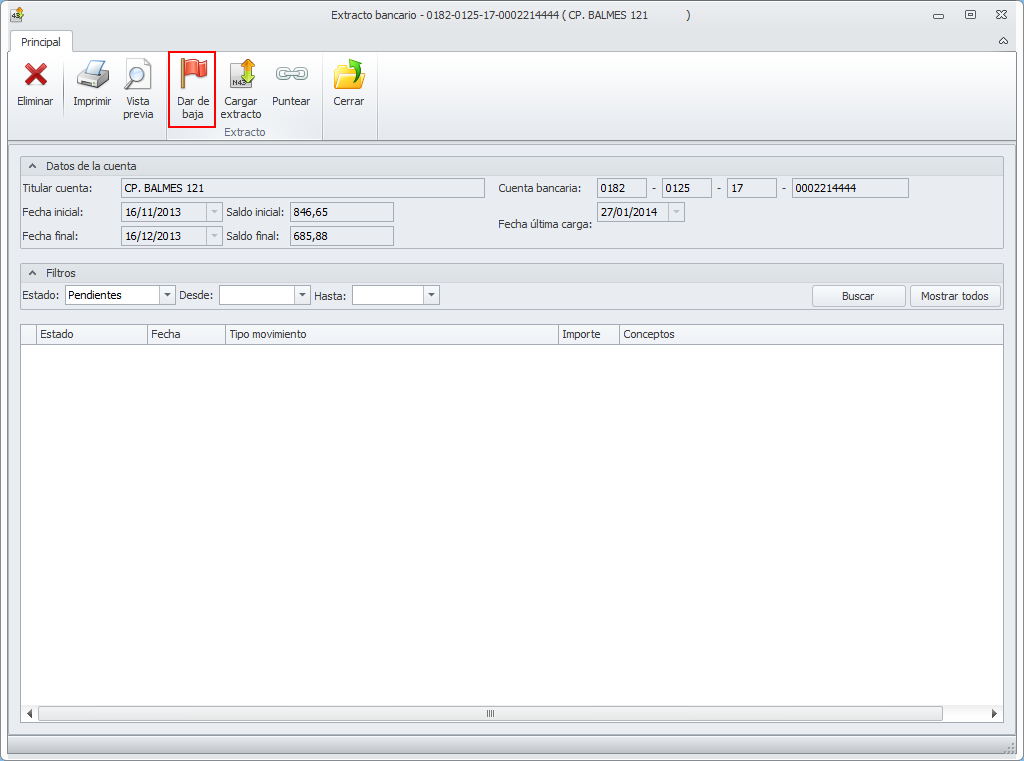 2.- Entrando en la ficha del extracto y haciendo clic en el botón Dar de baja.