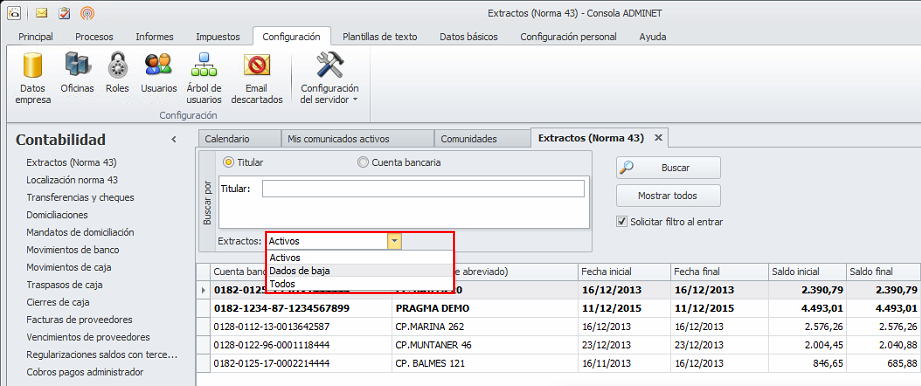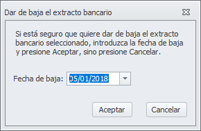 Se incorpora la posibilidad de dar de baja un extracto bancario. Es útil cuando una comunidad ha cambiado de número de cuenta o de entidad bancaria. Tras añadir la nueva cuenta y dejar punteados todos los apuntes de la cuenta antigua es conveniente darla de baja para quitarla de la vista habitual de cuentas y para acceder a ella por error.