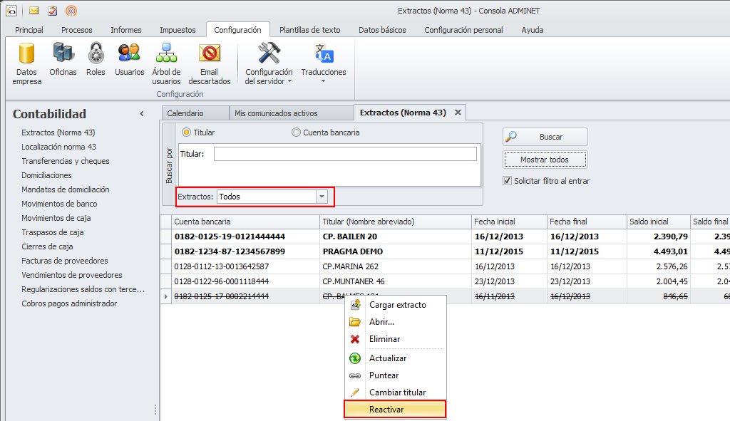 Si desea reactivar un extracto que ha sido dado de baja, haga clic derecho sobre él y escoja la opción Reactivar.