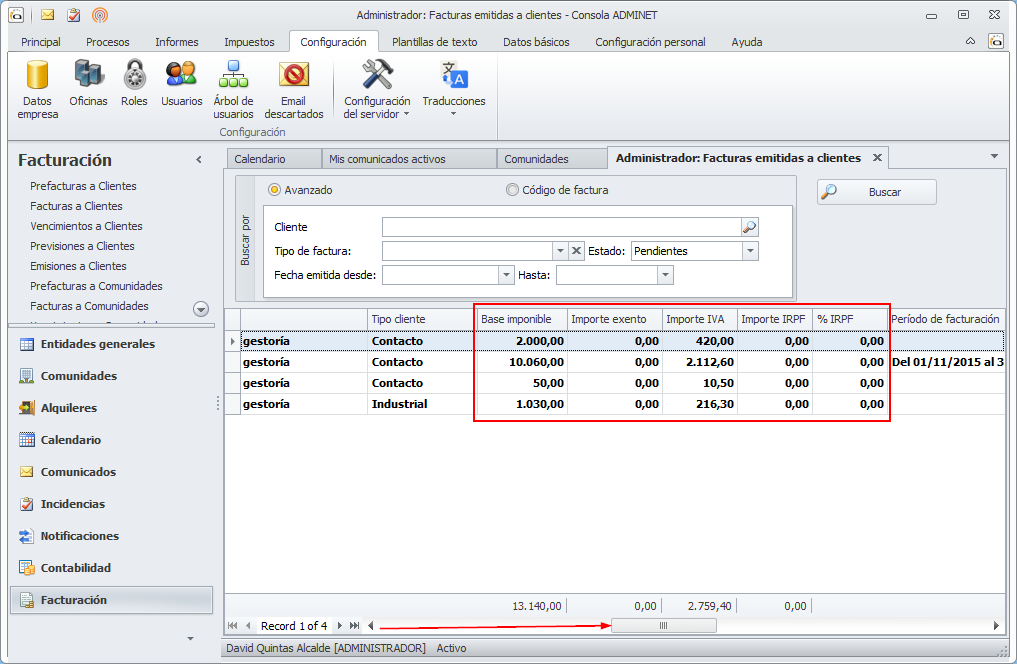 Columnas Base imponible, Importe exento, Cuota IVA, Cuota IRPF e Importe total en vistas de facturas emitidas y recibidas