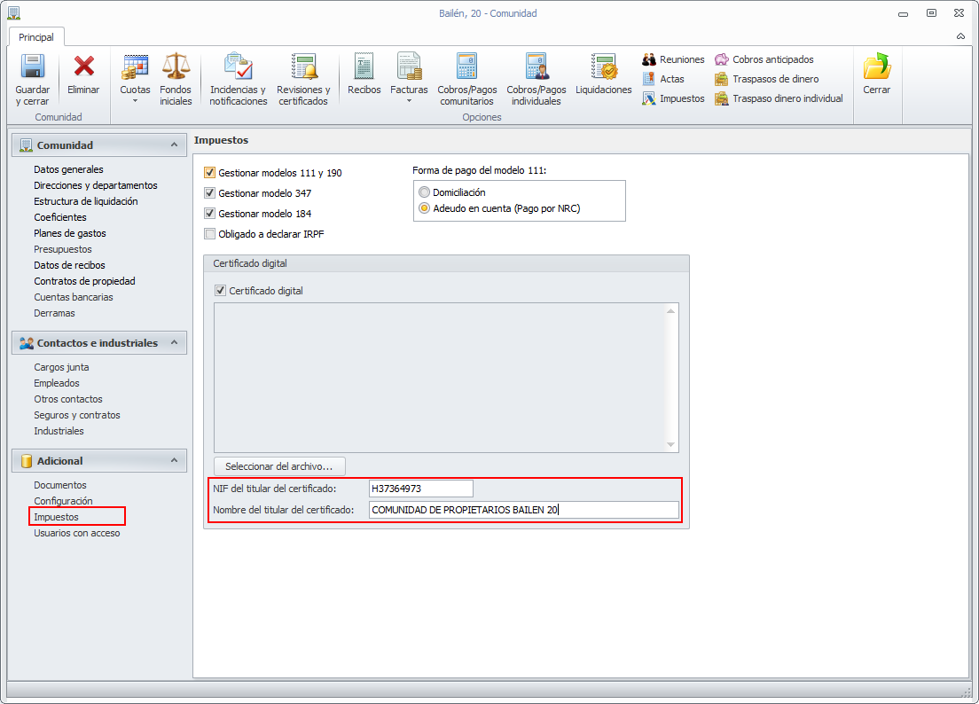 Vemos a continuación la sección Impuestos de la ficha de la comunidad.