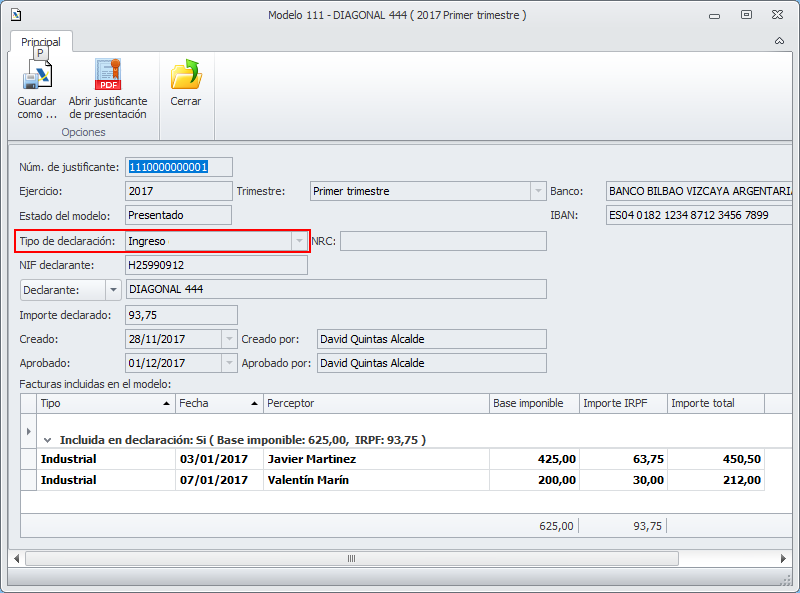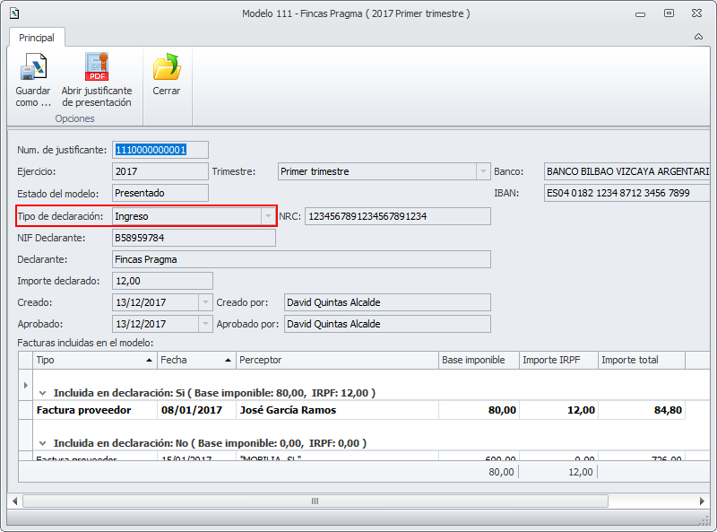 Tipo de declaración Ingreso en la ficha del modelo 111 de la comunidad