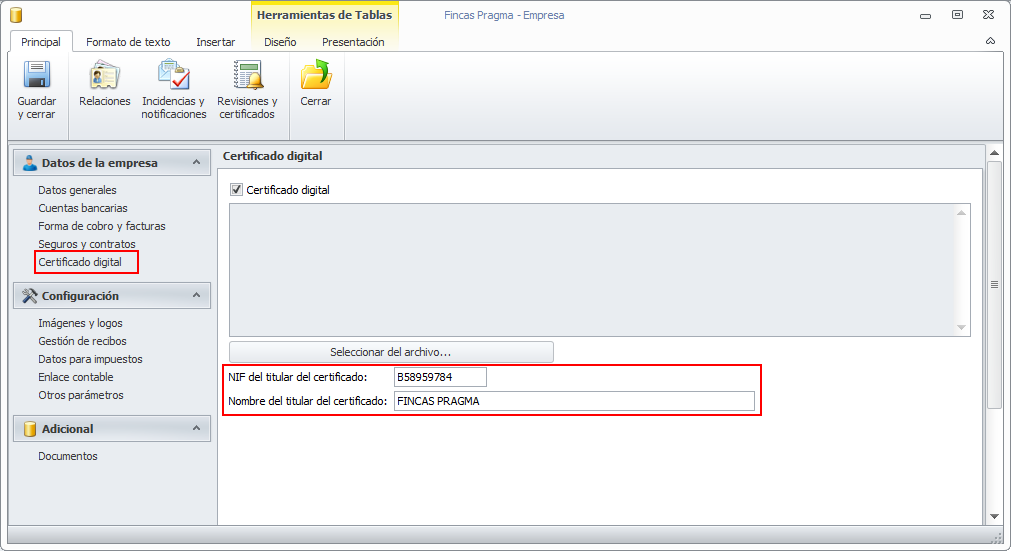Vemos a continuación la sección Certificado digital de la ficha de Datos empresa.