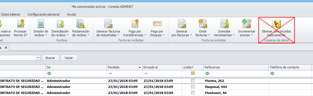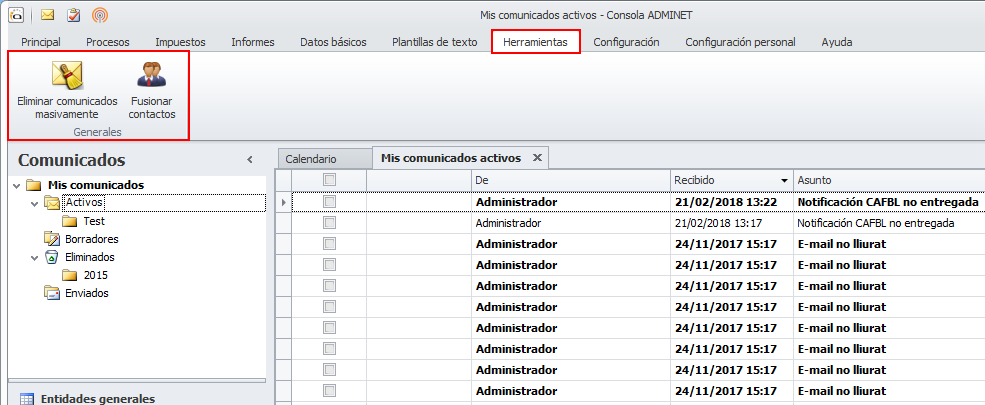Actualmente contiene dos herramientas: Fusionar contactos y Eliminar comunicados masivamente. La opción Eliminar comunicados masivamente anteriormente estaba al final de las opciones del menú Procesos y ha sido reubicada en este menú.