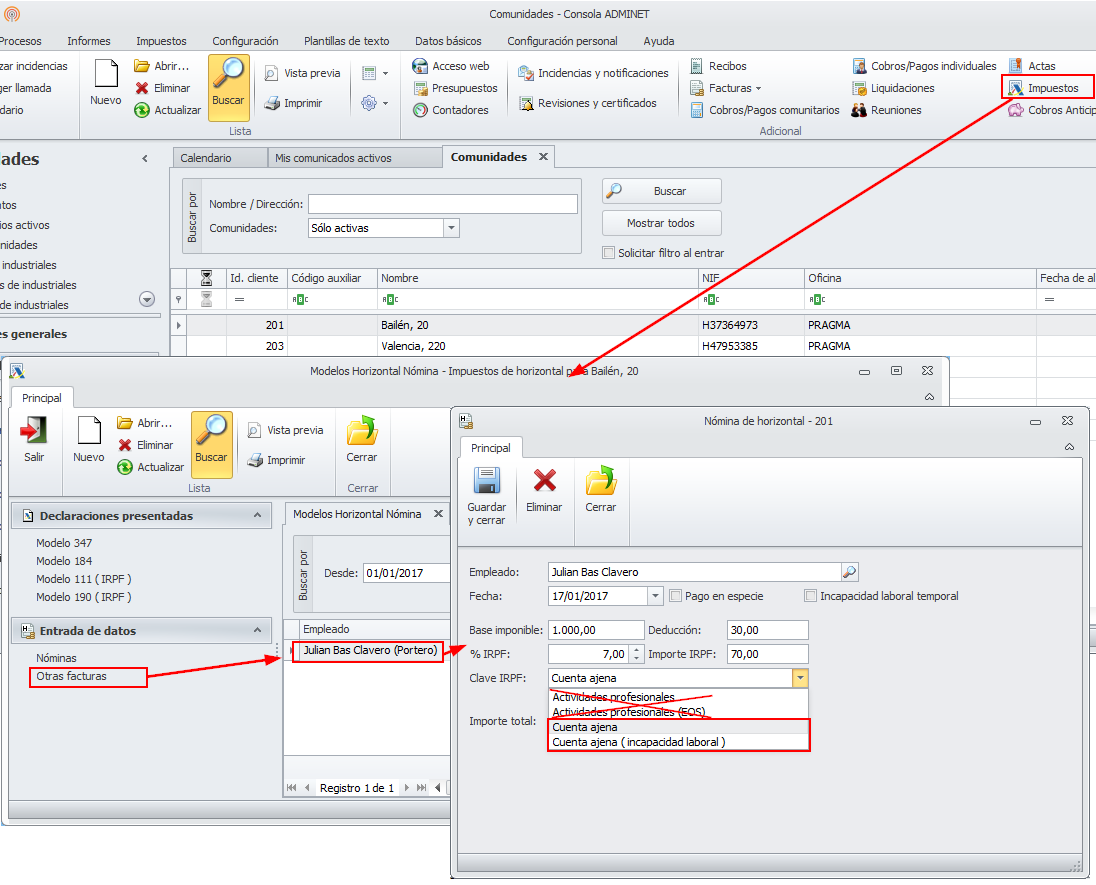 Se ha modificado el registro de nóminas de empleados de la comunidad para que al seleccionar la clave de IRPF se omitan las opciones relacionadas con Actividades profesionales y sólo se permitan seleccionar las que corresponden al trabajo por Cuenta ajena.