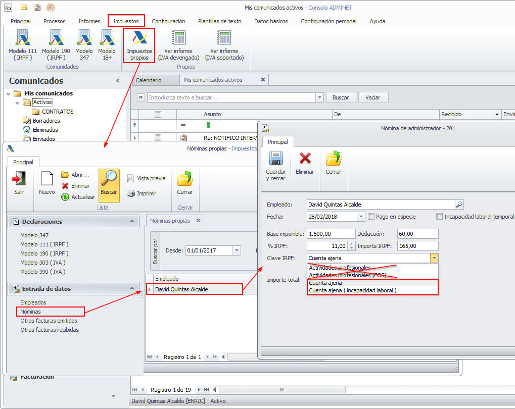 Se ha modificado el registro de nóminas de empleados del administrador para que al seleccionar la clave de IRPF se omitan las opciones relacionadas con Actividades profesionales y sólo se permitan seleccionar las que corresponden al trabajo por Cuenta ajena.