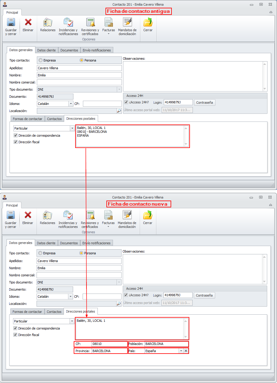 Se han modificado las direcciones postales, en las fichas de contactos, industriales y usuarios para añadirle las casillas Código postal, Población, Provincia y País. Estos datos son imprescindibles únicamente si se usa el Servicio de notificaciones fehacientes del Colegio de Administradores de Fincas de Barcelona i Lleida (CAFBL) . En ese caso se deben separar los datos código postal, población, provincia y país del cuadro de la dirección, como en la siguiente imagen.