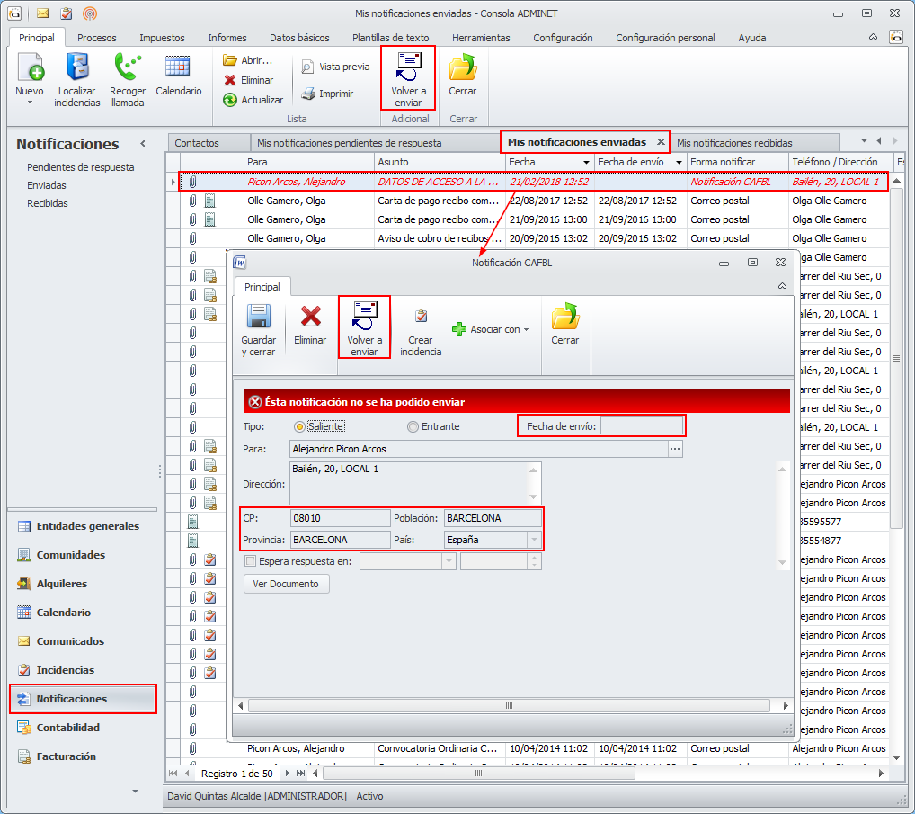Envío de notificaciones a través del Servicio de notificaciones fehacientes del Colegio de Administradores de Fincas de Barcelona i Lleida (CAFBL)