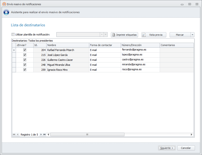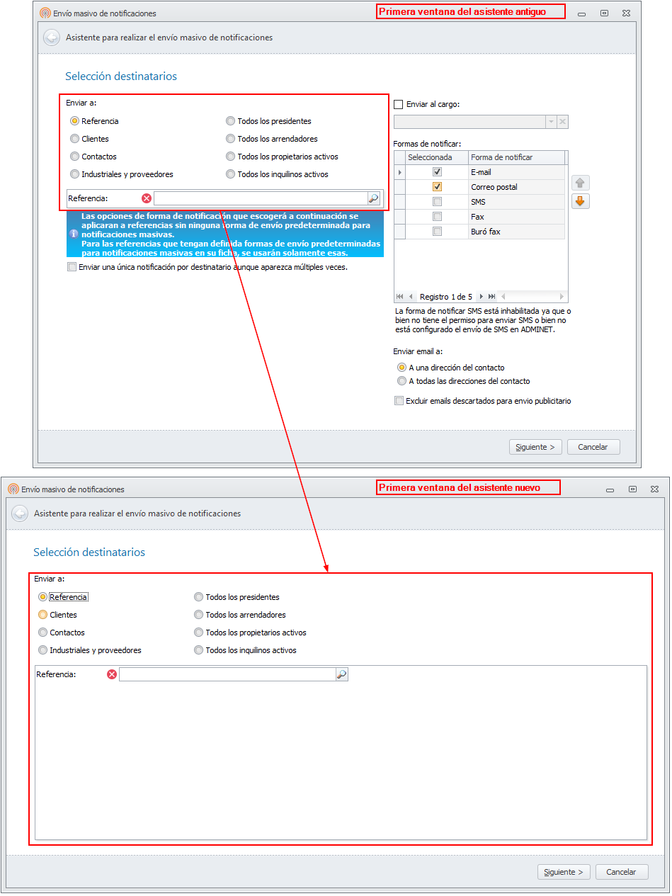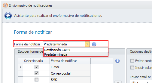 En el asistente de todas ellas se incluye la petición al usuario de qué tipo de notificación se desea emplear. Veamos un ejemplo en el Envío masivo de notificaciones.