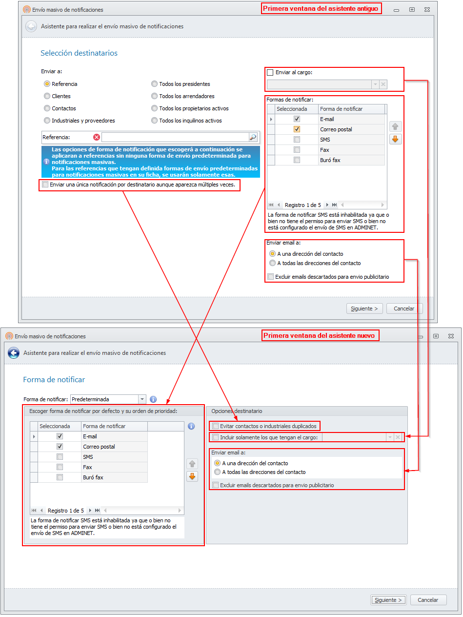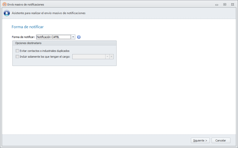 En esta ventana cabe destacar que la antigua casilla Enviar una única notificación por destinatario aunque aparezca múltiples veces se ha convertido ahora en Evitar contactos o industriales duplicados.