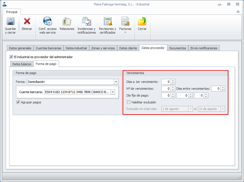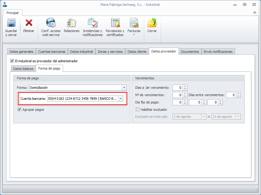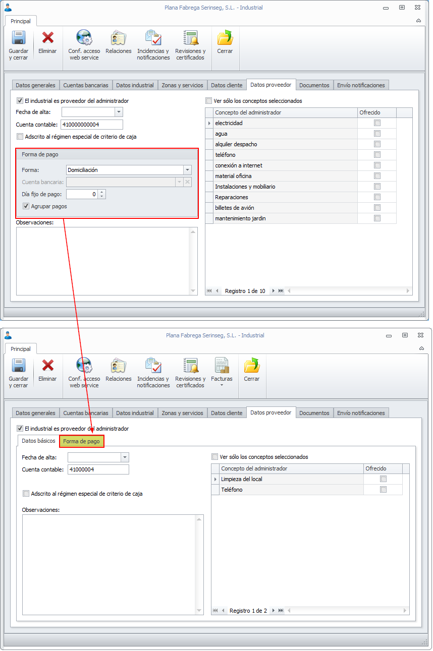 Se ha remodelado la ficha del proveedor. Los datos correspondientes a la Forma de pago de las facturas se traslada a una nueva pestaña.