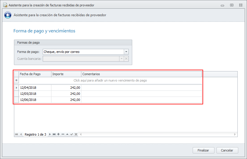 El asistente de registro de facturas de proveedores calcula los vencimientos de pago de la factura a partir de los nuevos datos añadidos a la ficha de proveedor.