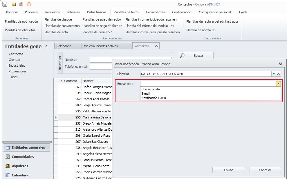 En los diferentes asistentes de notificaciones masivas de adminet se incluye la opción de notificar a través de Notificaciones CAFBL. Estos asistentes son: