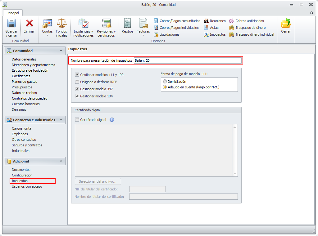 Se ha añadido una nueva casilla en la sección Impuestos, tanto en la ficha de la comunidad como de la macrocomunidad, para indicar el nombre con el que se debe identificar la comunidad en los modelos (111, 190, 184 y 347) que se declaran a la AEAT. A continuación tiene un ejemplo de cómo se ve ahora la ficha de la comunidad.