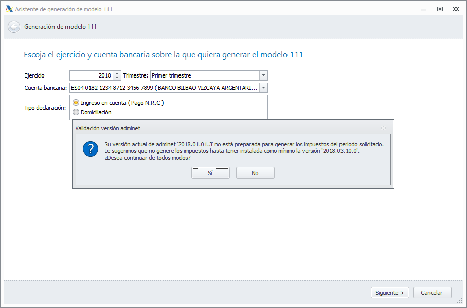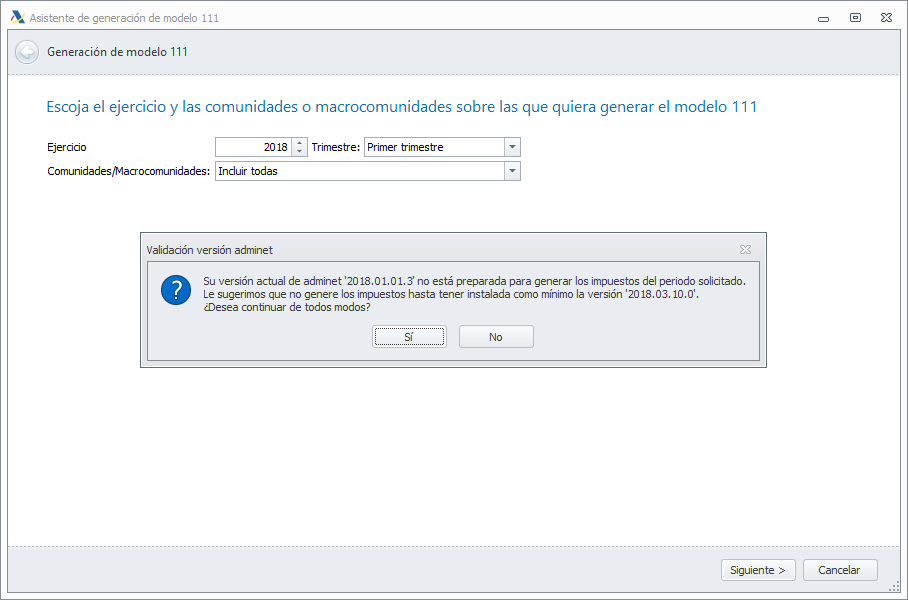 Al solicitar la generación de un modelo de impuestos, se verifica si la versión de adminet está actualizada para generar ese modelo. En caso de que no lo esté mostrará un mensaje advirtiéndolo.