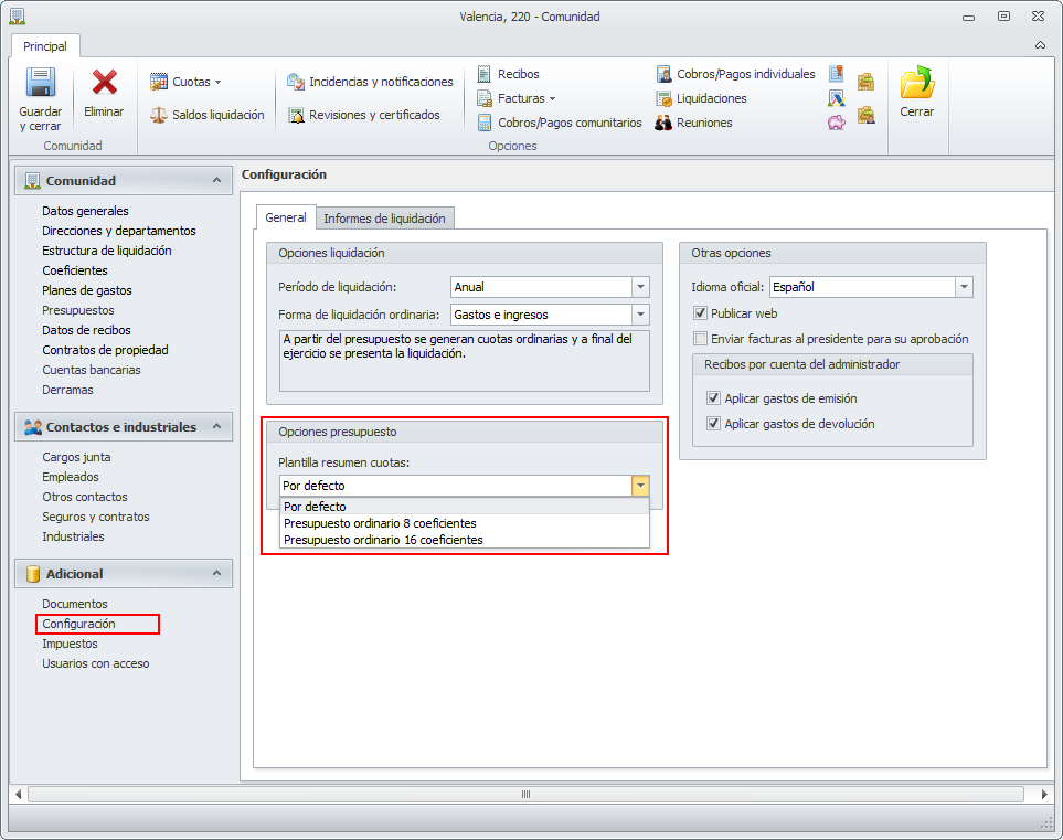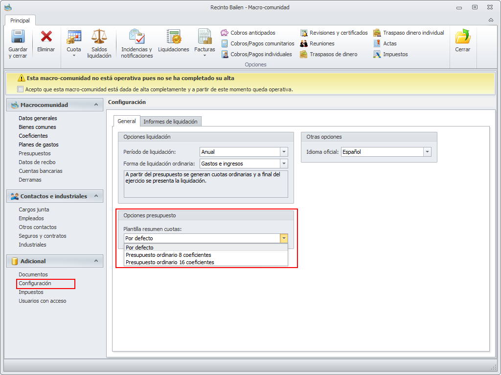 En la sección Configuración de las fichas de comunidad y macrocomunidad, se ha incorporado una nueva casilla que permite escoger entre diversas plantillas de presupuesto resumen.