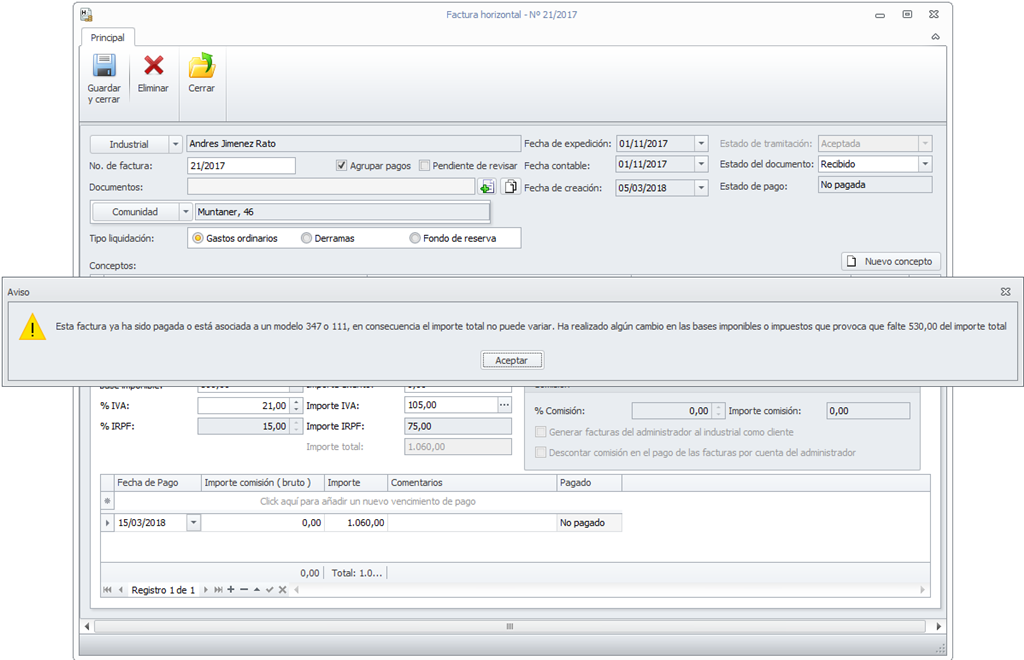 Se ha mejorado el control que se realiza para permitir la modificación de las facturas de industriales. En el caso de que una factura haya sido incluida en un modelo 111, se podrá modificar la ficha de la factura, siempre y cuando no se altere ni el tipo de IRPF ni el importe de IRPF ni el total factura. Si se intenta modificar, al guardar los datos, muestra un mensaje como el siguiente: