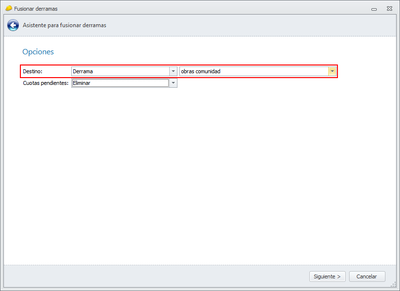 En el asistente de la herramienta Fusionar derramas, se incorpora la posibilidad de que el destino de la derrama a fusionar sea otra derrama.