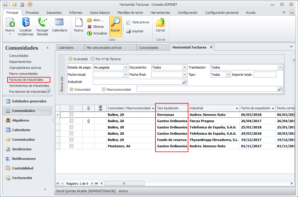 Se ha incorporado una nueva columna en la lista de facturas de industriales, que indica el tipo de liquidación al que pertenece cada factura.