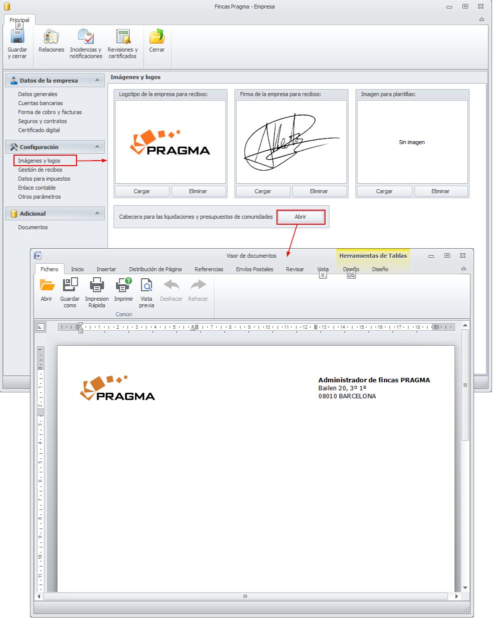 Ha sido modificada la sección Imágenes y logos de la ficha Datos empresa. El cuadro Cabecera para las liquidaciones y presupuestos de comunidades ha sido extraído en una ventana aparte, a la cual se accede desde esta ventana.