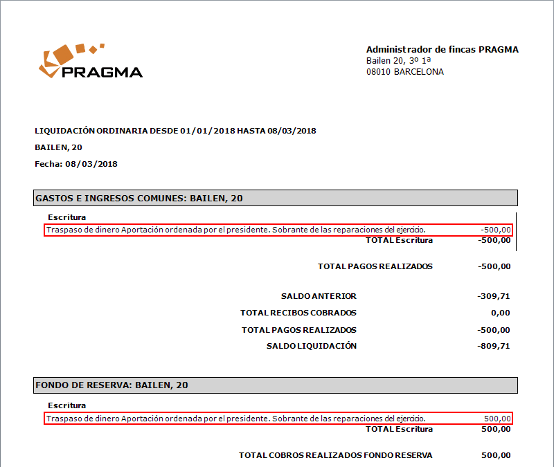 En el caso de que la comunidad disponga de fondo de reserva, es habitual realizar traspasos de dinero entre el fondo ordinario y el fondo de reserva. Estos movimientos serán siempre detallados, a partir de ahora, en el informe de liquidación general.