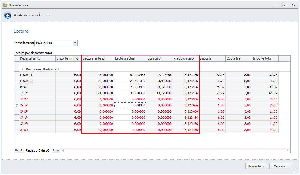 Se ha modificado también la ficha de la lectura de contadores para ampliar a 6 el número de decimales en las lecturas y el consumo.