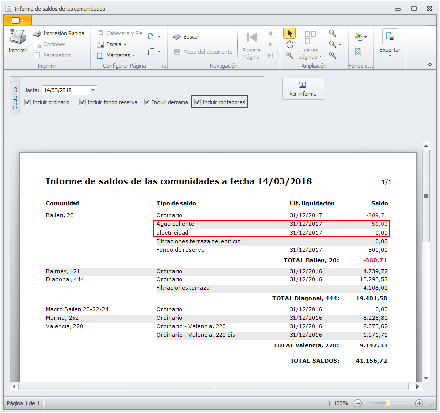 En este informe la activación de la casilla Incluir contadores afectará sólo a los contadores que se deban liquidar por separado. Los que se liquidan junto a lo ordinario se acumulan siempre en el saldo ordinario, que se imprime en el informe si se ha activado la casilla Incluir ordinario.
