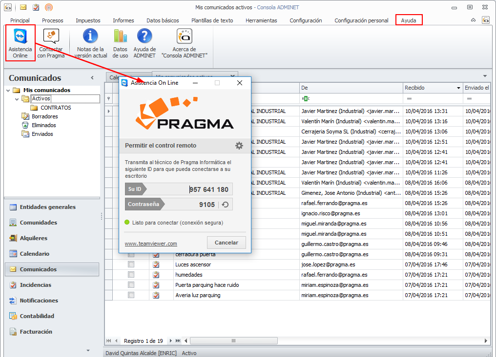 Se ha modificado el comportamiento del botón Asistencia Online del menú Ayuda para que descargue y abra directamente la aplicación Team Viewer sin pasar por la web de Pragma.