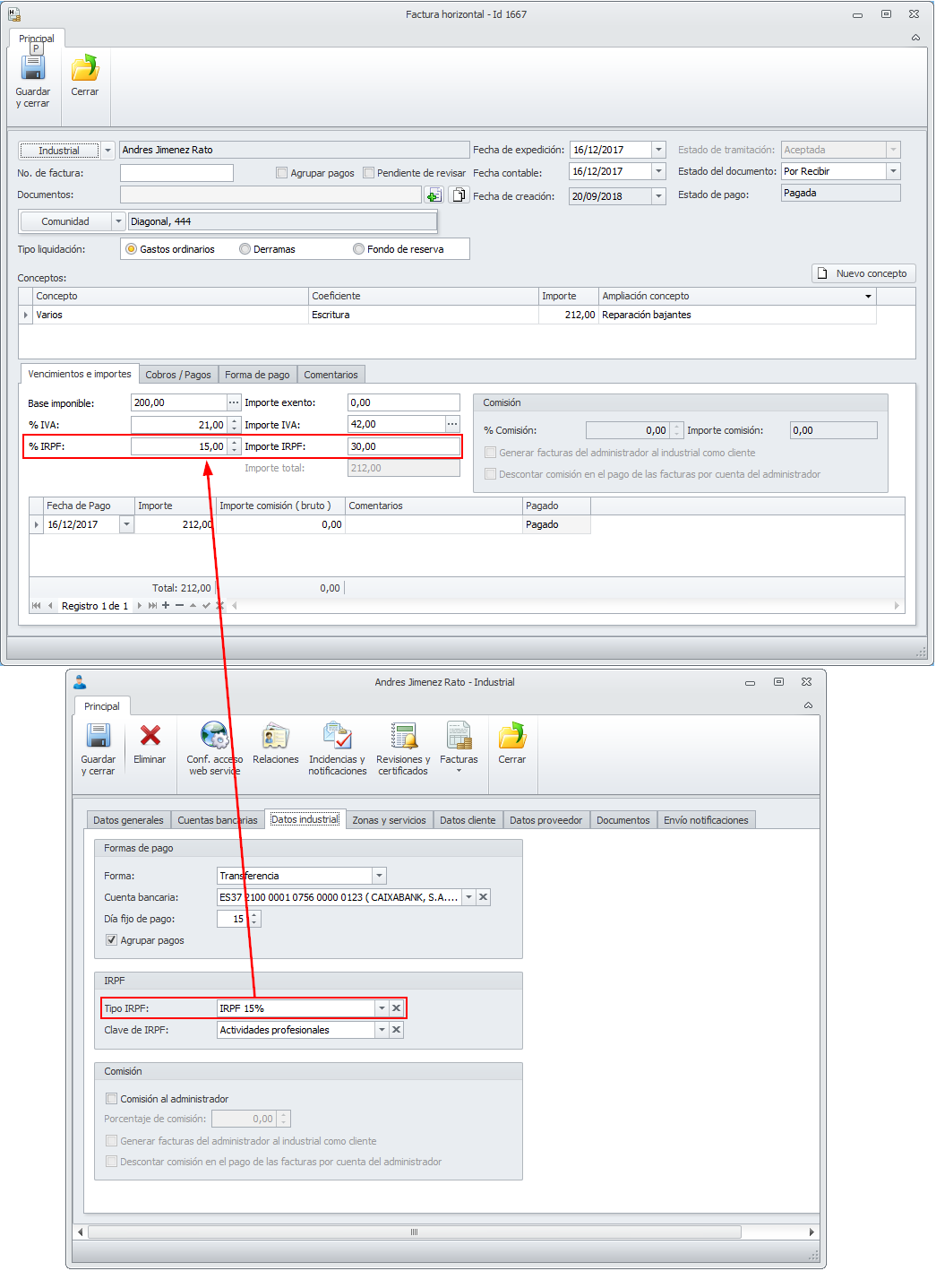 En el proceso de la norma 43, al generar facturas de industrial para comunidades o de proveedor para el administrador, se analiza si el industrial aplica IRPF en sus facturas, reflejando esta circunstancia en la creación de la factura.