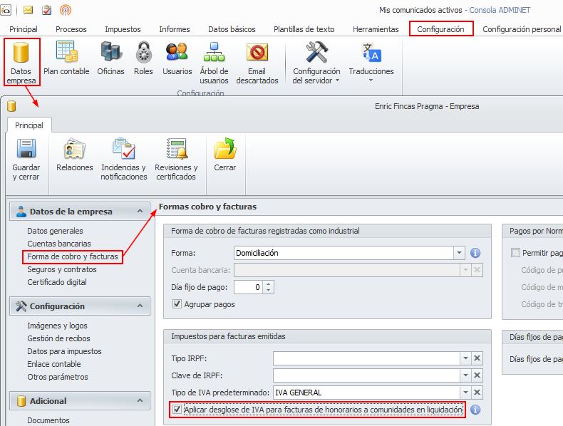 En la ficha de datos empresa se dispone de la casilla Aplicar desglose de IVA para facturas de honorarios a comunidades en liquidación.