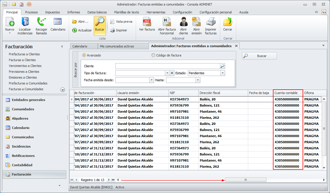 En las listas de facturas emitidas a clientes, comunidades y arrendadores se incorpora una nueva columna para mostrar la cuenta contable de cliente. Esta columna sólo será visible si en la ficha de datos empresa se tiene activado el enlace contable.