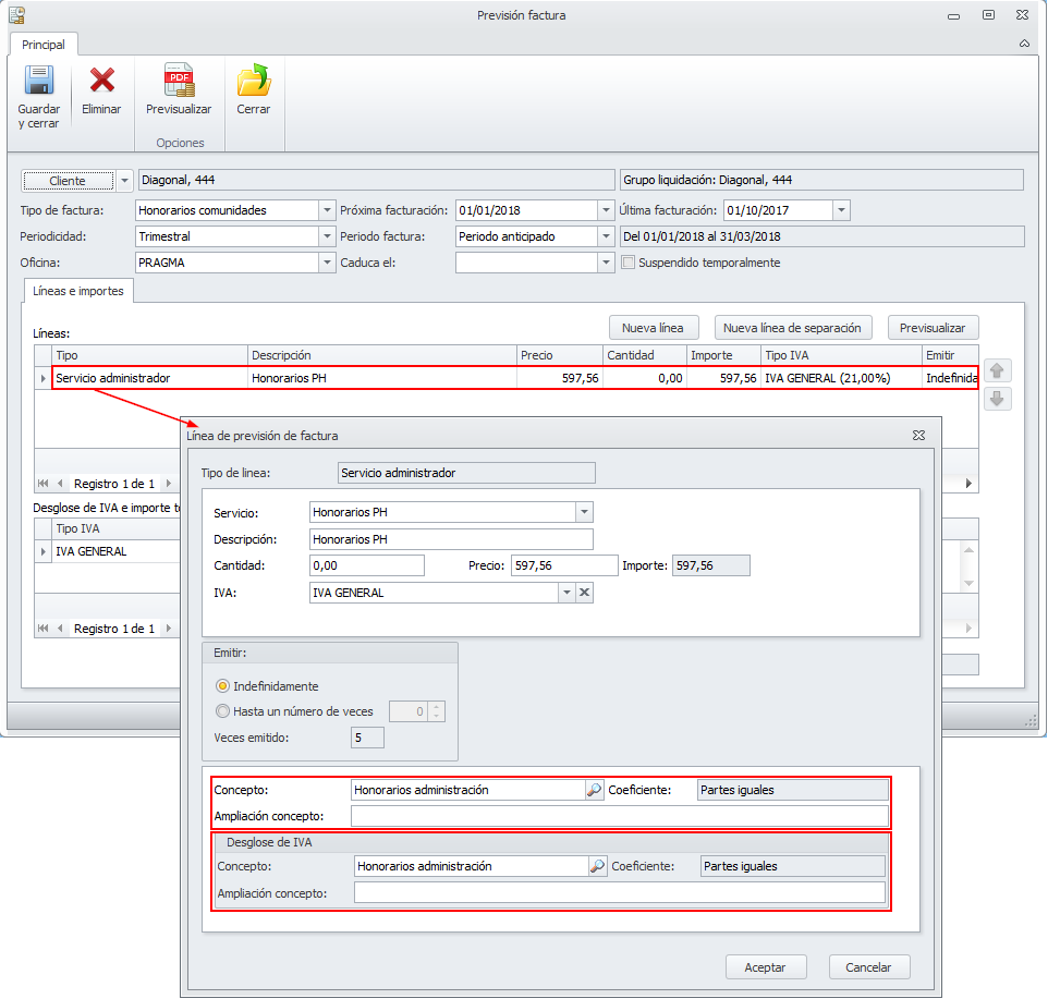 Permitir poner el mismo concepto para la base imponible y la cuota de IVA en las pre-facturas y previsiones a comunidades