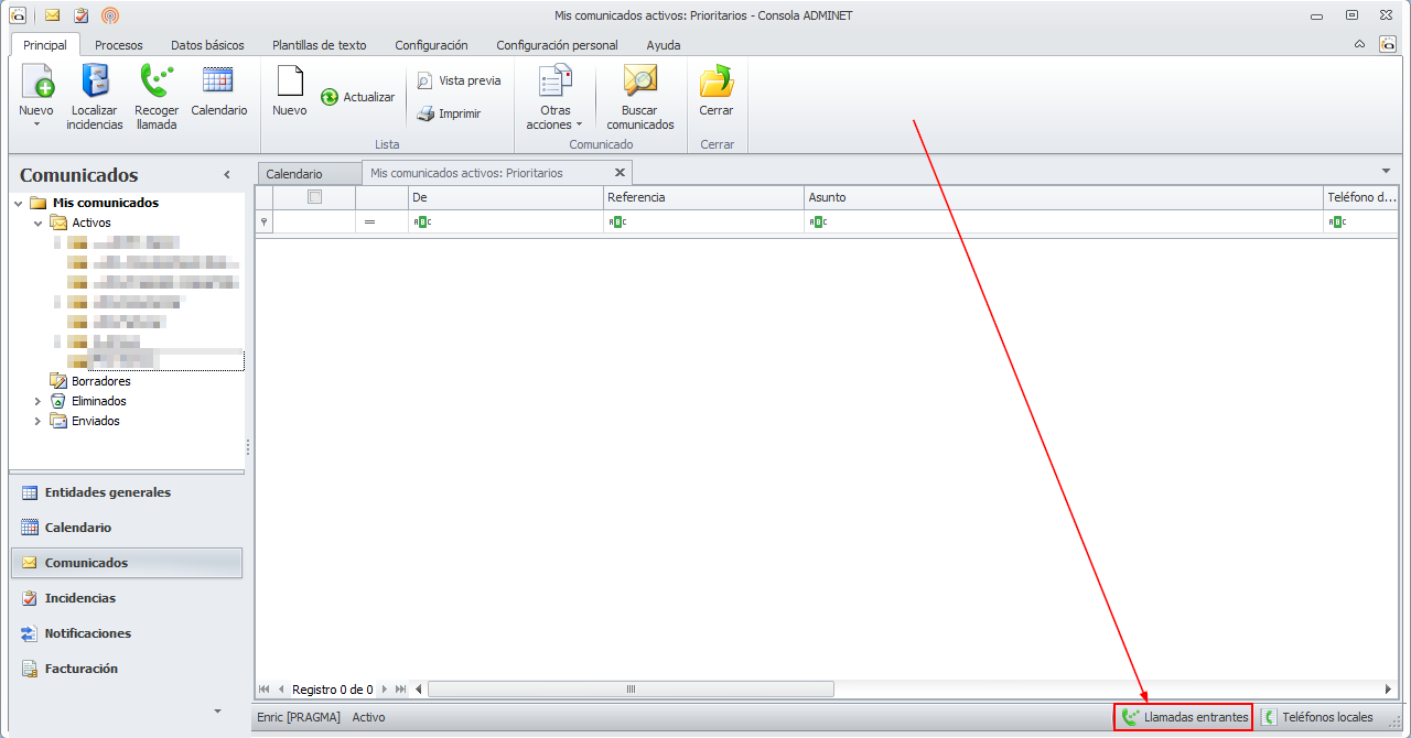 Se incorpora un nuevo botón en la ventana principal de adminet con el texto Llamadas entrantes. Este botón sólo estará disponible si tiene configurada en adminet una centralita vozIP.