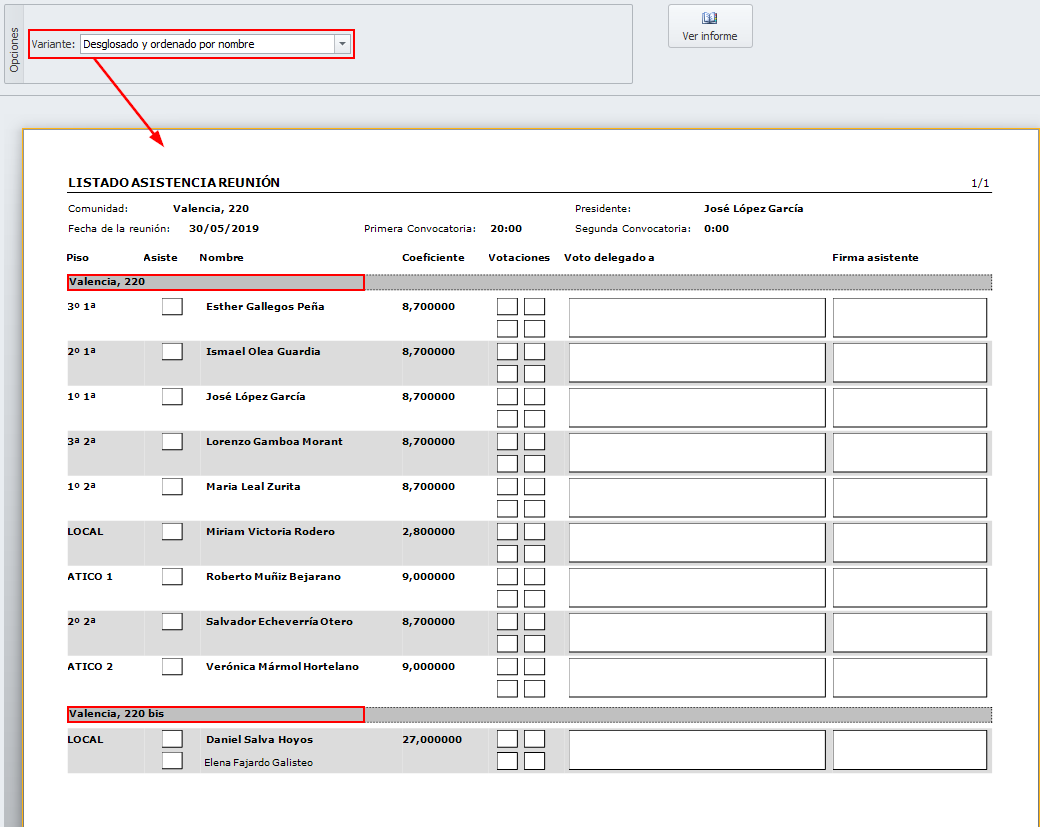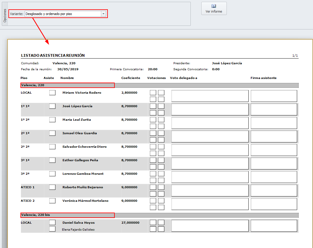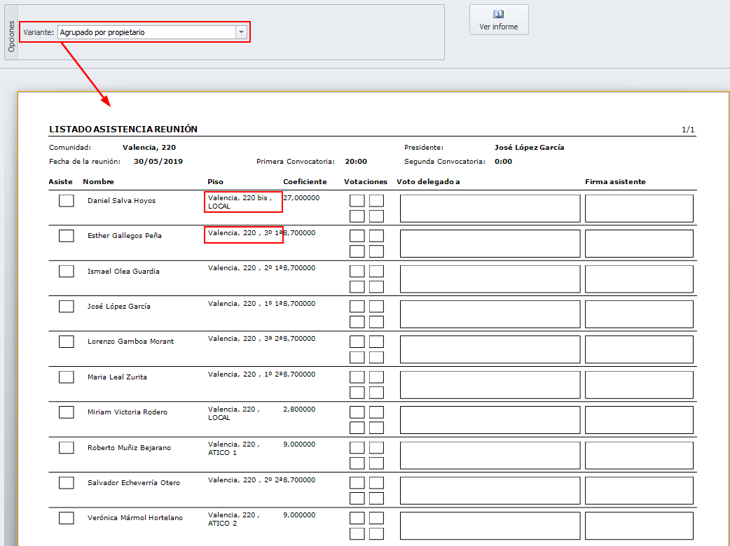 Se ha mejorado el listado de asistencia a reuniones, añadiendo en todos los informes la dirección de la finca. A continuación, puede ver ejemplos de las diferentes versiones de listado de asistencia que se puede obtener.