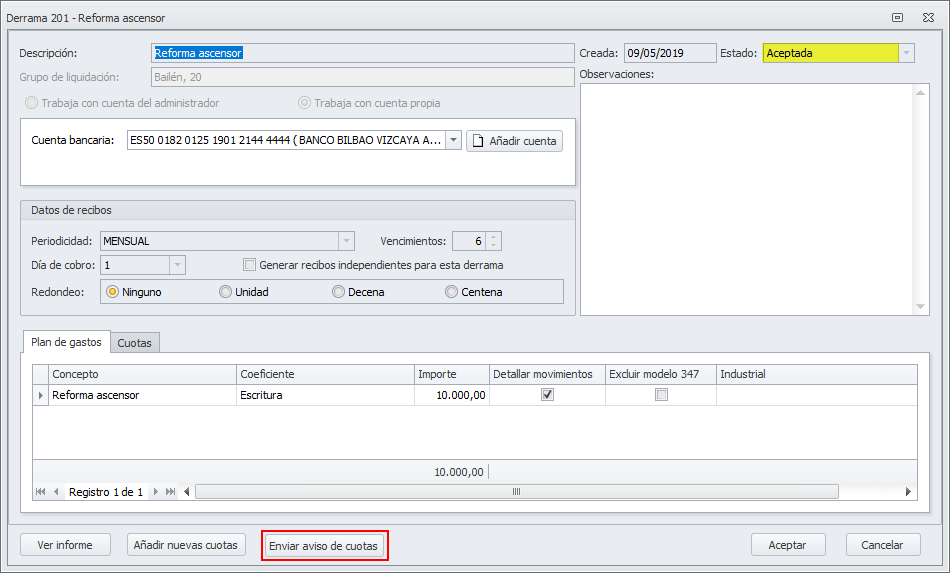 Se ha incorporado en la ficha de la derrama, una vez ha sido aceptada, un botón que permite efectuar un envío de avisos de las cuotas que se van a emitir.