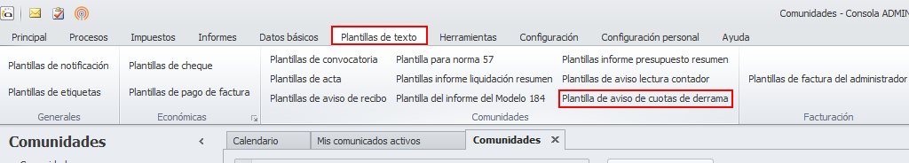 Si desea adaptar la plantilla de notificación a su gusto la puede encontrar accediendo al menú Plantillas de texto y haciendo clic en Plantilla de aviso de cuotas de derrama.