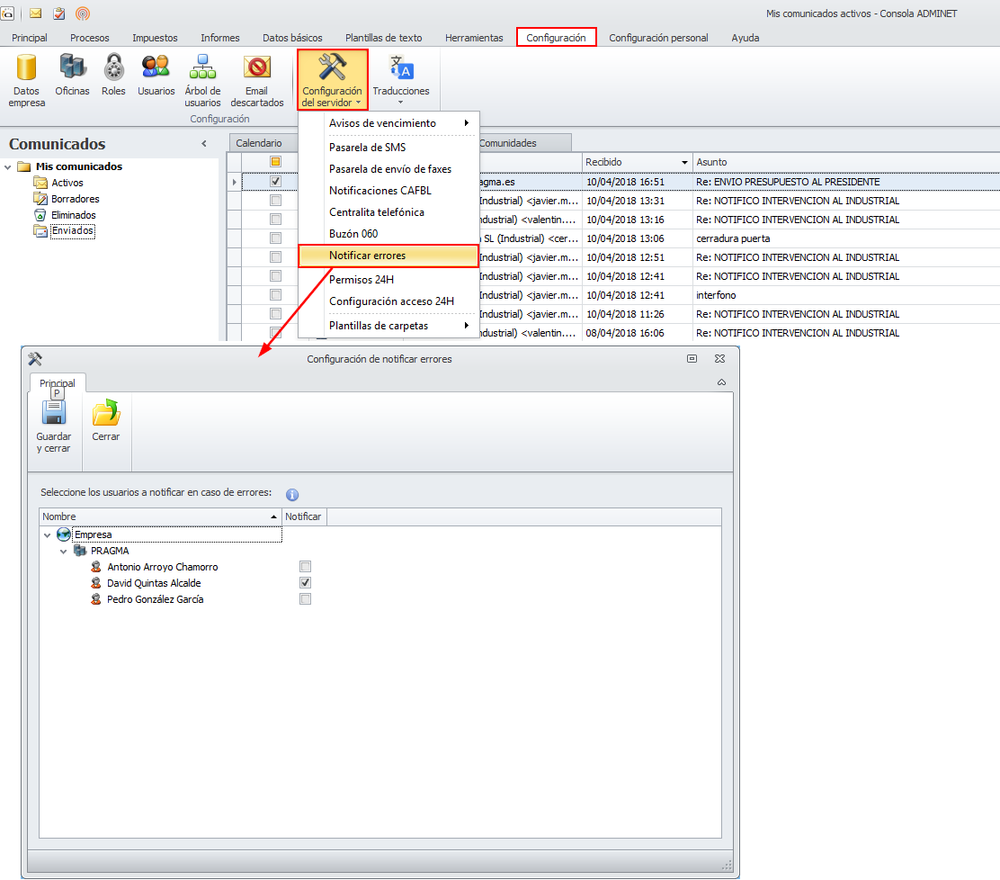 Se incorpora una opción en la Configuración del servidor que permite escoger a qué usuarios, además del usuario Administrador, se desea que adminet notifique determinados errores reiterados relacionados con los procesos de envío y recepción de:
