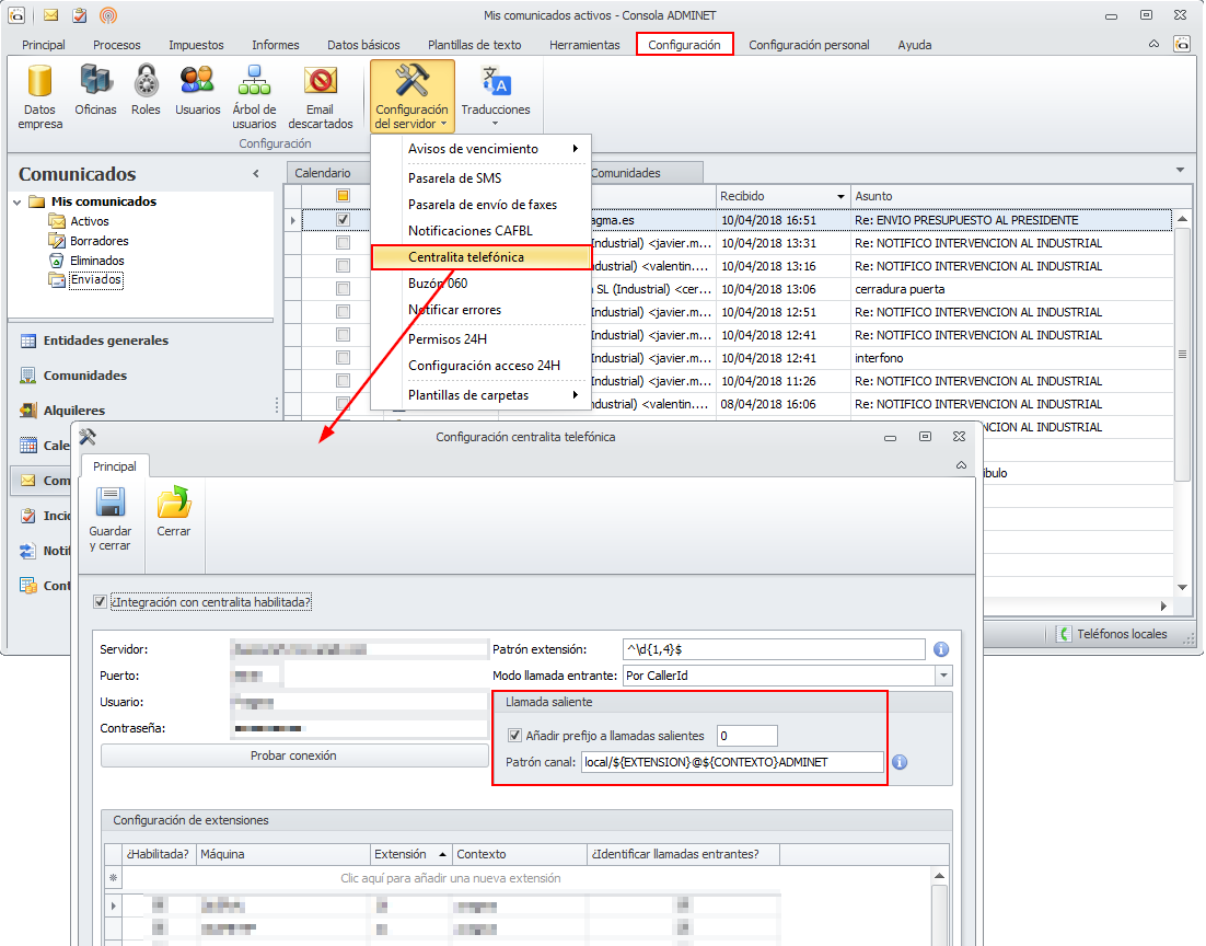 Permite consultar los teléfonos del resto de usuarios del despacho, incluyendo móviles y fijos. También permite registrar en adminet el resultado de llamadas realizadas entre usuarios y, en el caso de tener configurada en adminet una centralita vozIP, realizar la marcación automáticamente desde el programa.