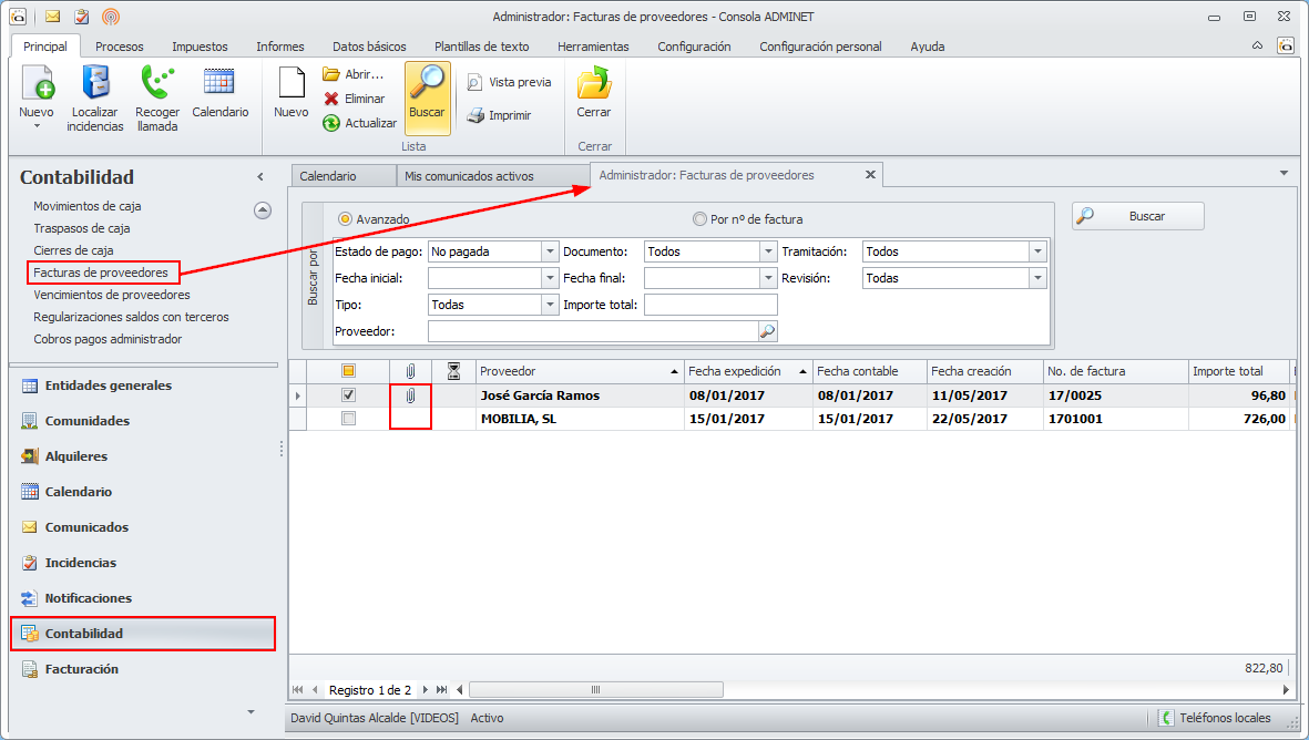 Se ha modificado la vista de facturas de proveedores, para indicar, por cada factura, si tiene documento asociado. En caso de tenerlo se muestra el correspondiente clip en la columna destinada a ello.