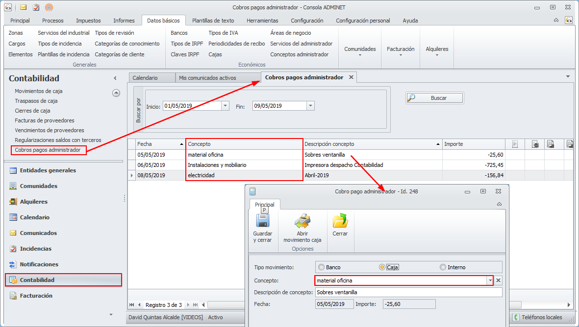 Se ha añadido una columna para mostrar el Concepto del administrador en la vista de cobros pagos.