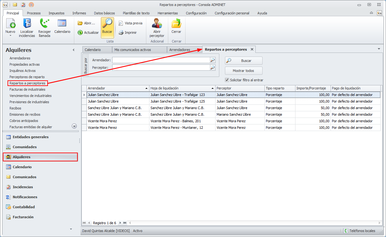 Se ha añadido en el apartado de Alquileres una nueva opción llamada Repartos a perceptores.