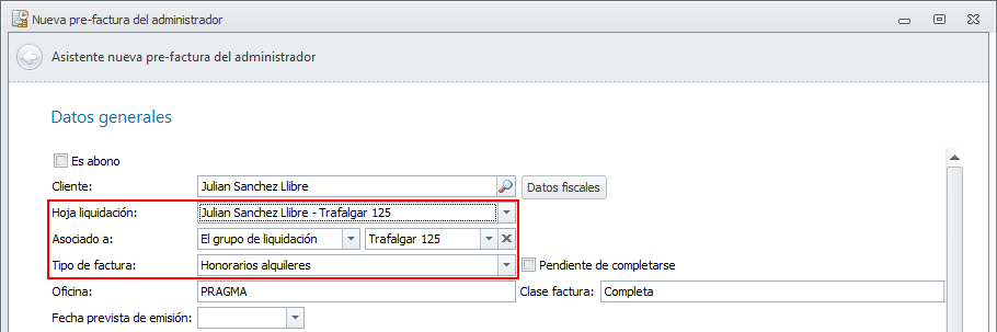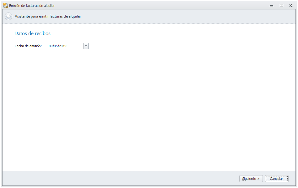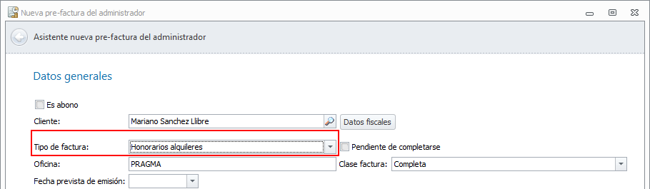 Al hacer clic en el botón, se abre el asistente de emisión de facturas de alquiler.